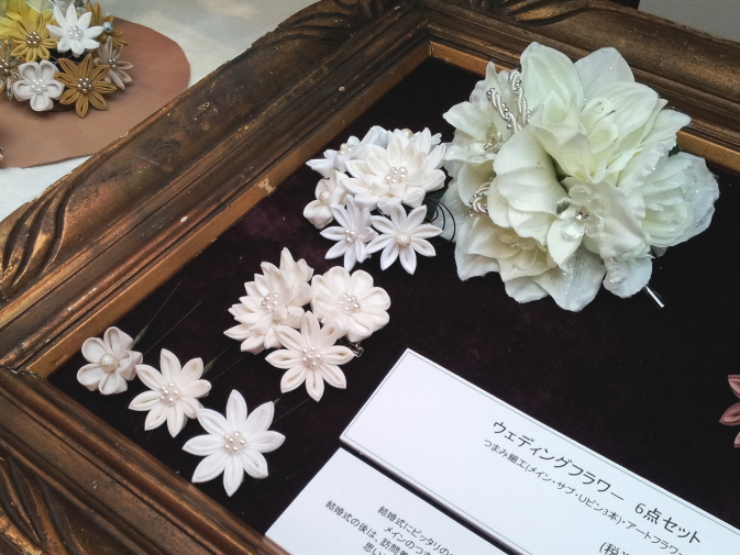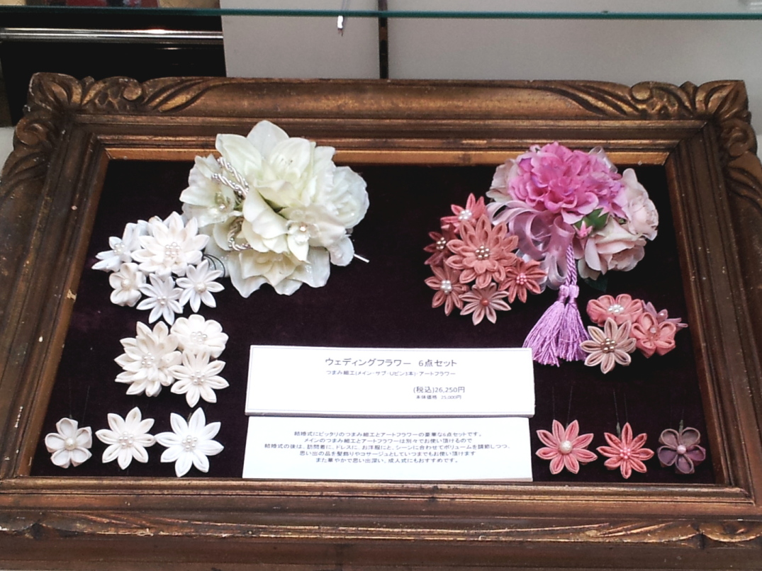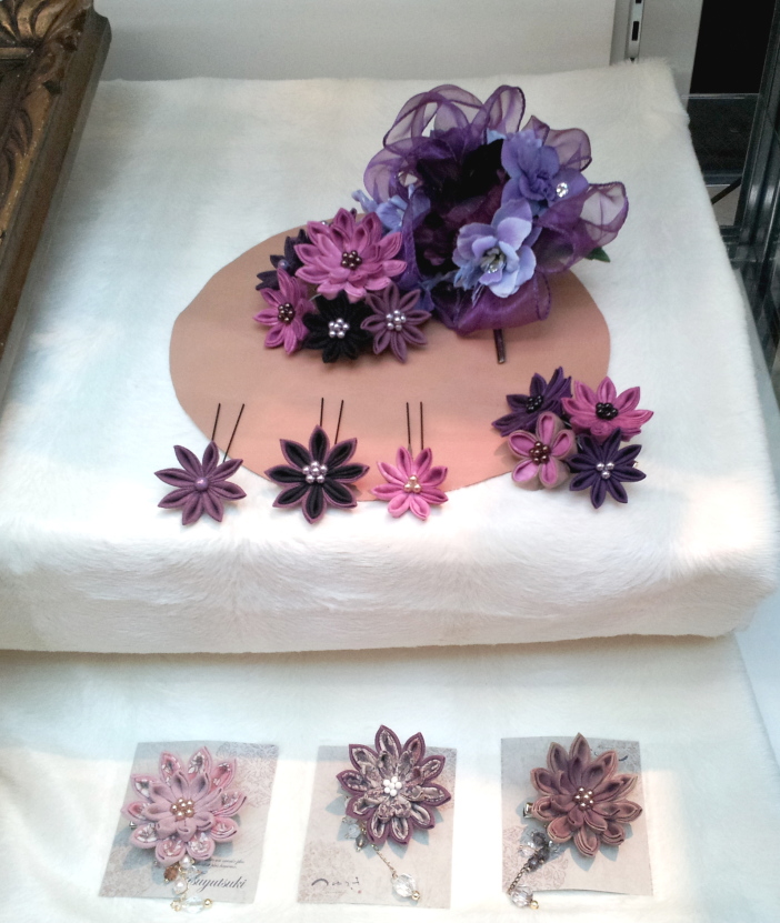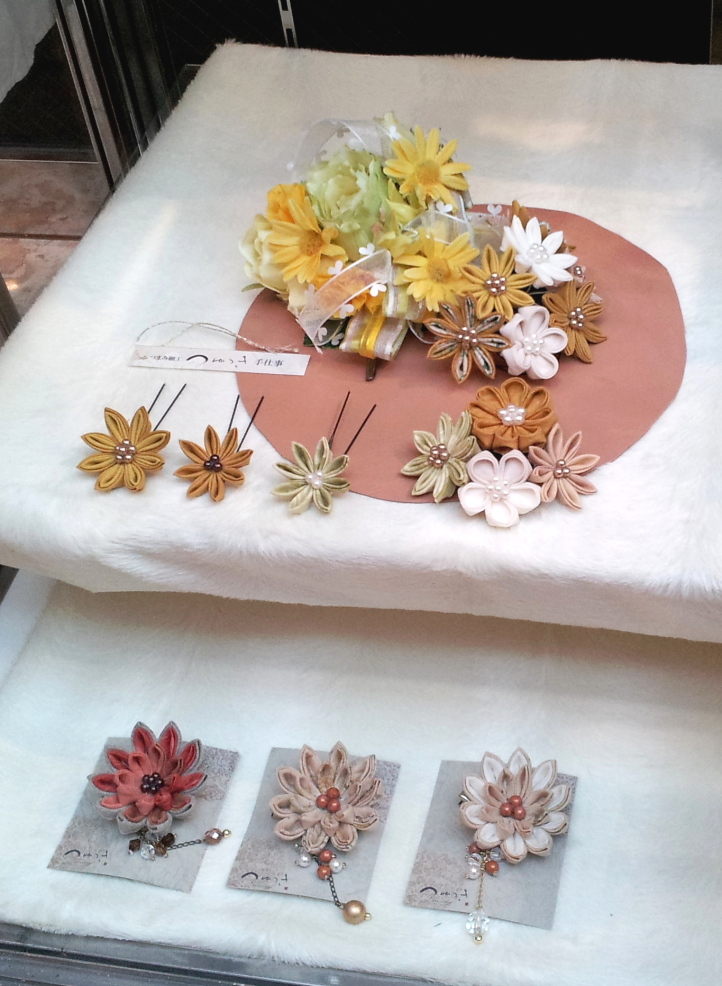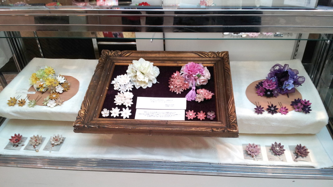 和装の髪飾を3/2から3/8まで恵比寿ガーデンプレイスの三越で 販売していただきました。 つまみ細工作家のつゆつきさんとのコラボ作品です。 セットでディスプレイしてみると、単品のフラワーアレンジとはまたちがった世界。