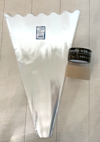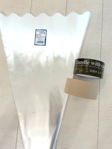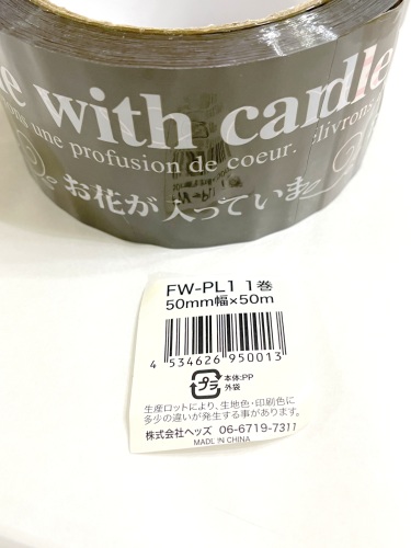 | ワイヤーは束ねてフラワーパックへ。フラワーテープは1m程度 お分けしていれていますが、スタート時に一巻ご購入いただくのでもOKです。 | 「お花がはいっています」のテープの品番です。 このテープで梱包するのではなく、【お花が入っています】の部分だけカットして、荷物に貼ってメッセージとして使用しています |