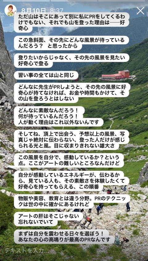 すると多くの方(普段は500名前後のところ800名以上の方)が閲覧し、自分のこととして、沢山の💓やDMをくださるのです。そしてじっくり読むので、視聴者の滞在時間が長くなります。
