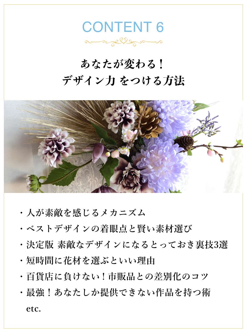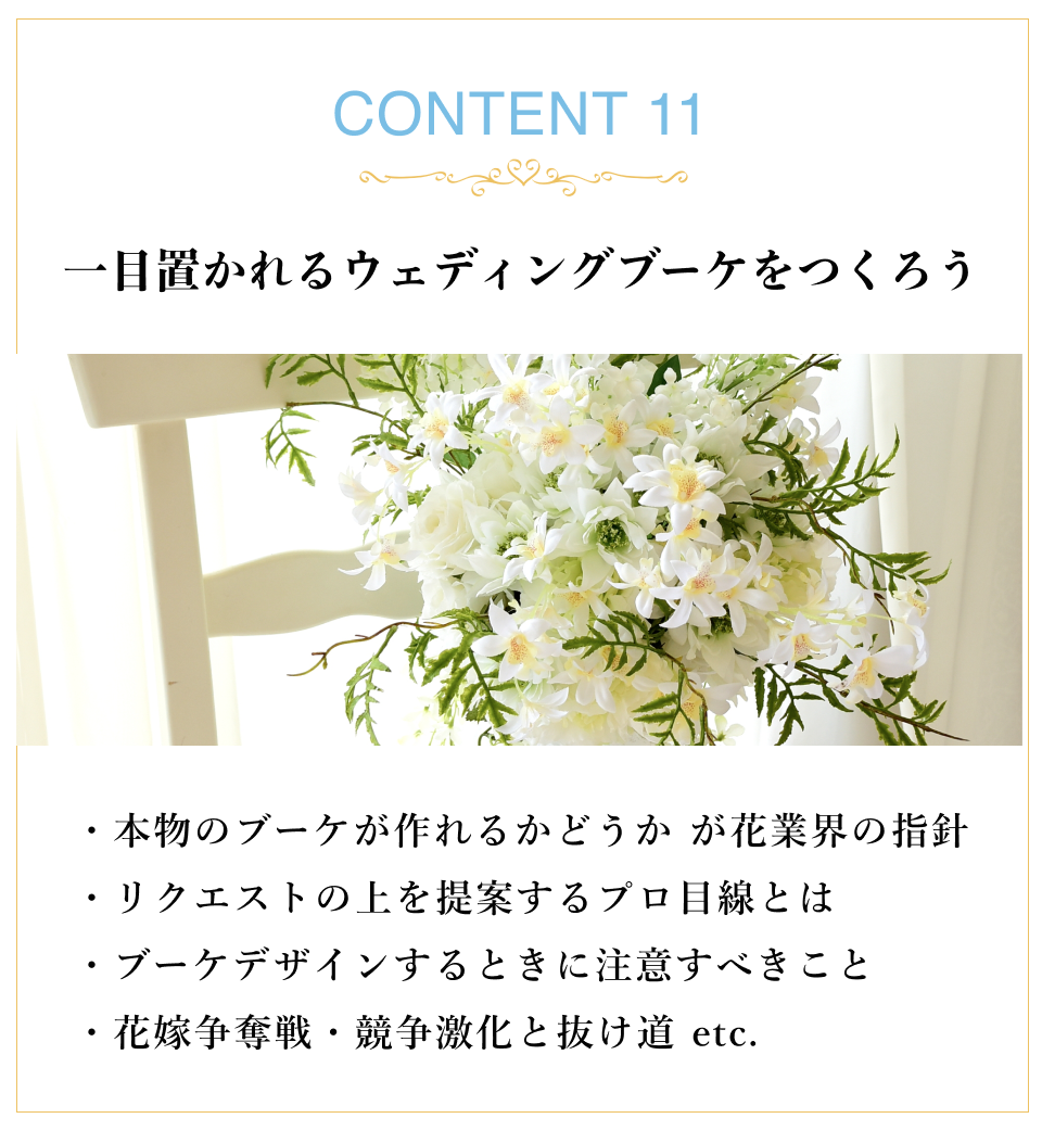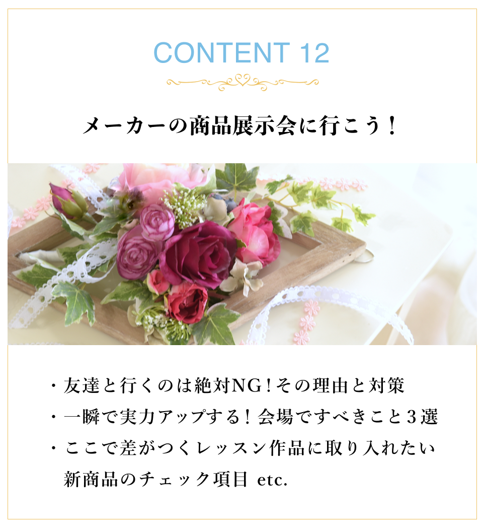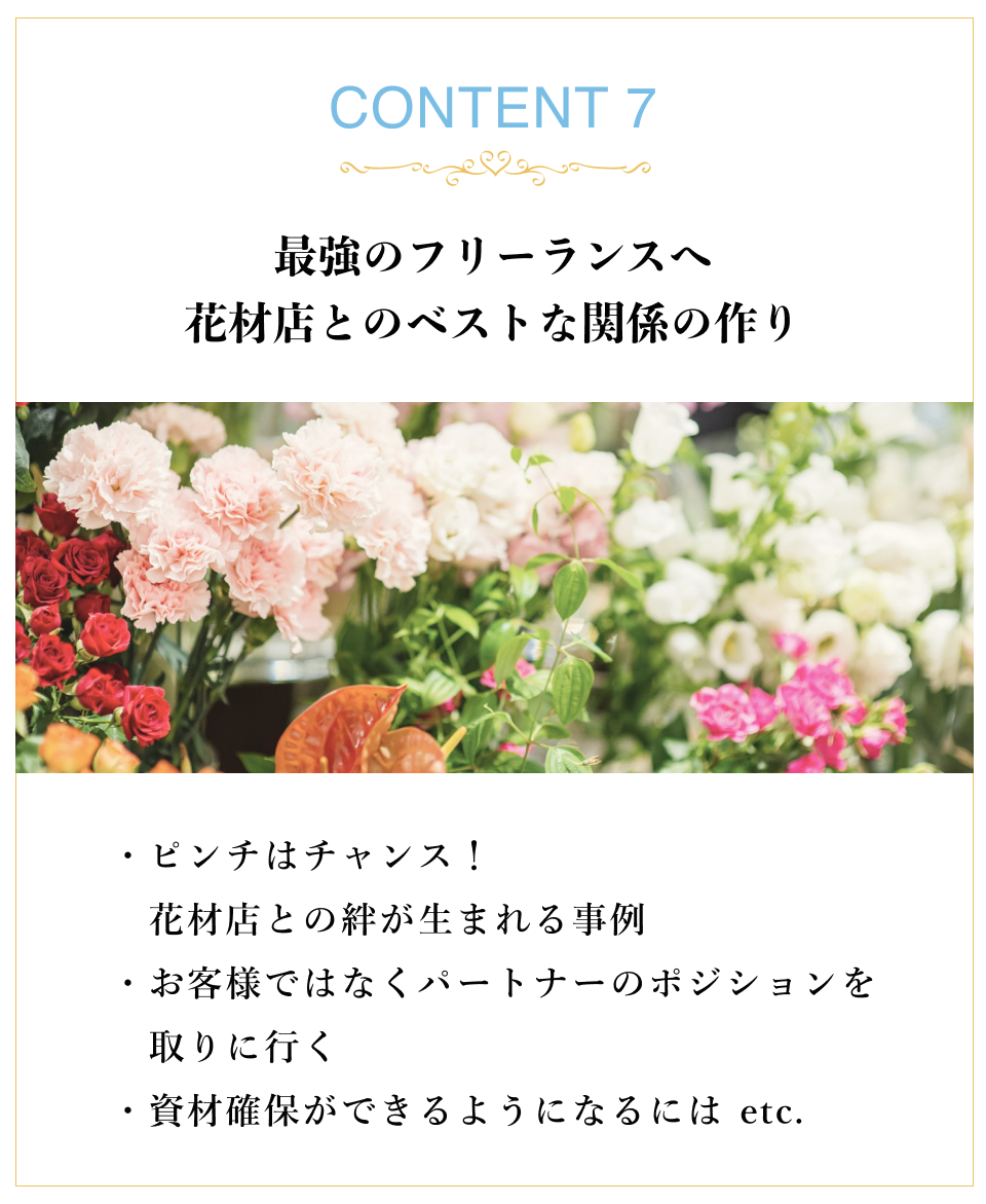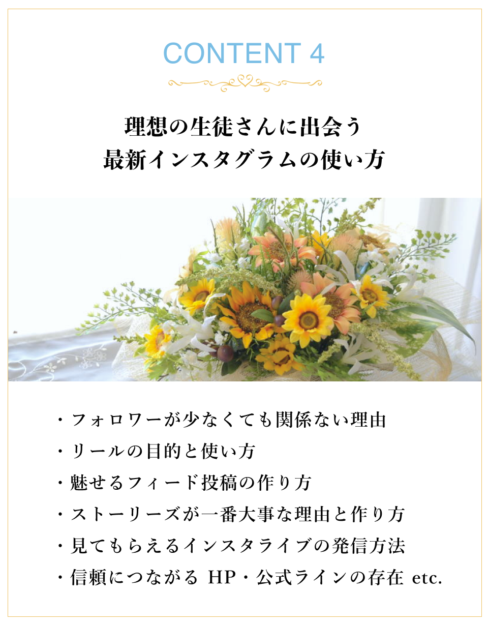 SNS運用や、デザインの考え方、今後お花のお仕事をしたいと思う先生に、大切なことが学べる講座はないかと思います