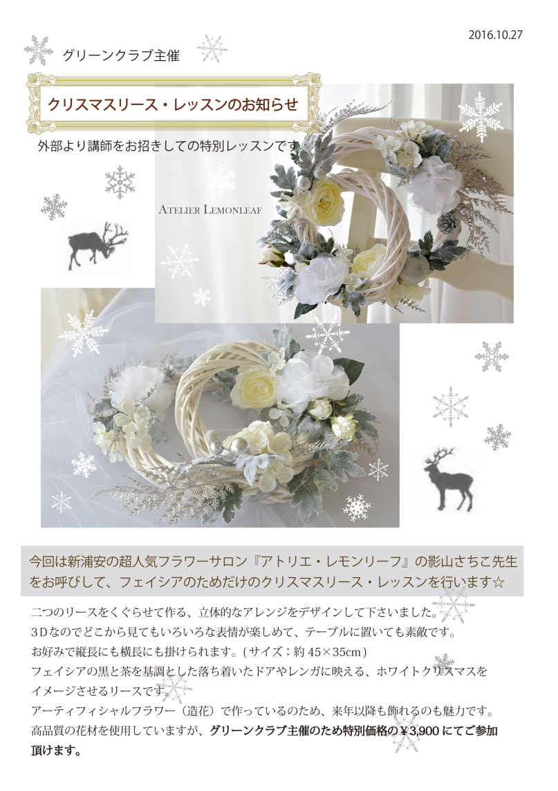 ![]() 武蔵の緑ひろがる、瀟洒なマンション. グリーンクラブ様よりクリリスマスレッスン講師として お招きいただきました 以下マンション内に掲示してくださったパンフレットです |