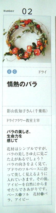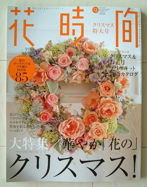 花時間 12月号(クリスマス号)に掲載されました 今年も載せていただきました。こうして花時間さんにお世話になるのはこれで6年連続となりました。何度載せていただいても、花に携わるものにとって憧れの「花時間」です。ありがとうございます。 この作品は以前,展示会で作ったリースです。ドライフラワーがこんなに綺麗なことを多くの皆さんに御伝えできたら嬉しいです。ビビッドは赤、それでいて見事な赤からオレンジへのグラディエーショ。これこそ自然の命のなせる業。本当に綺麗ですね。