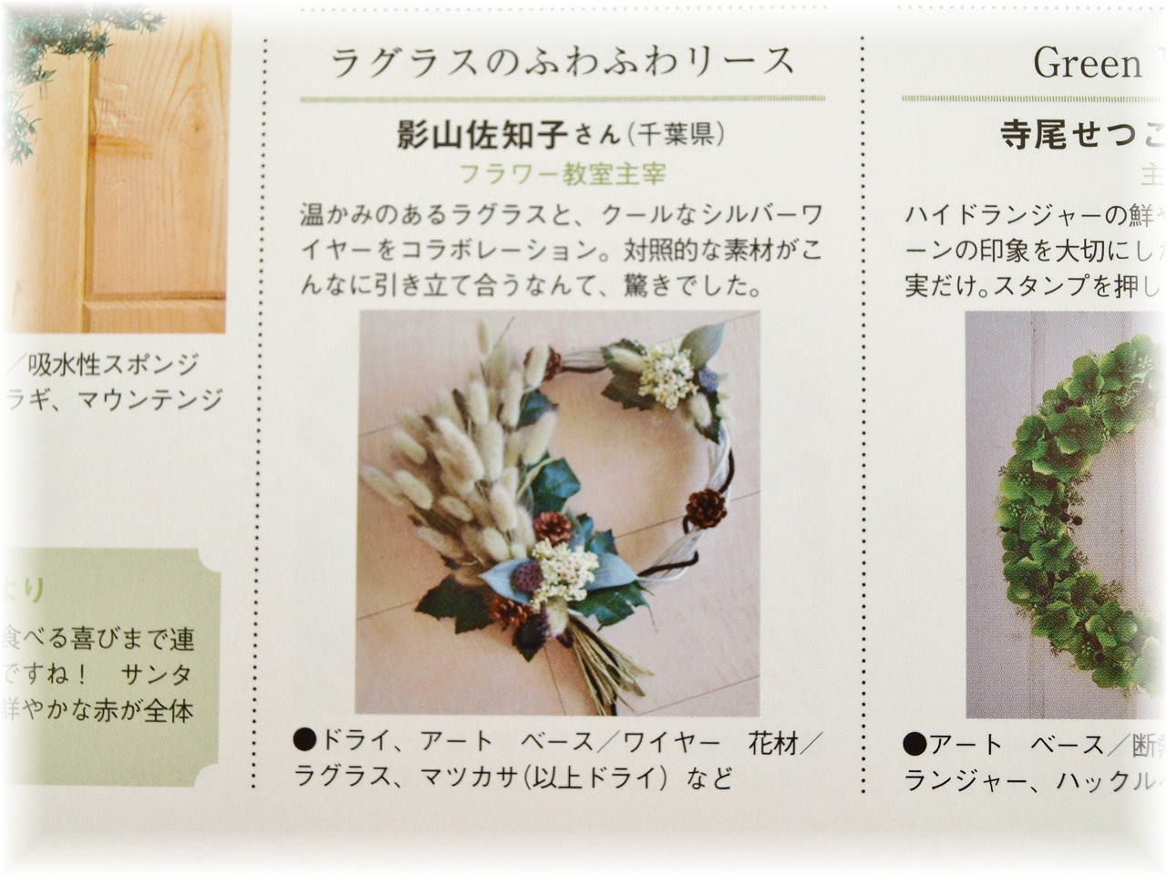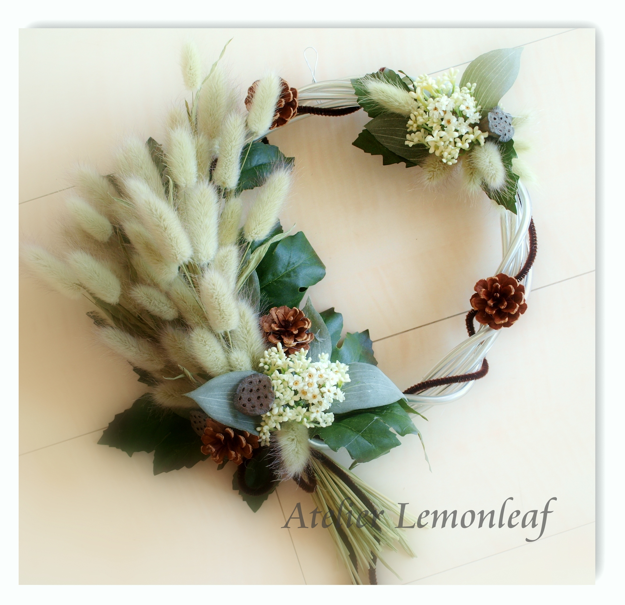 大好きなドライのラグラスをたっぷり使ったリースアレンジです。ベースはアルミのラインでどんな形にもなるスグレモノ。 くるくっとまるめて、シャープでクールな感じに。ふっくらほんわりしたラグラスの雰囲気が一見ミスマッチなようで、実はお互いの素材の風合いをひきたてあっています。