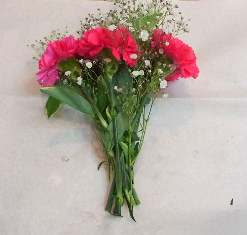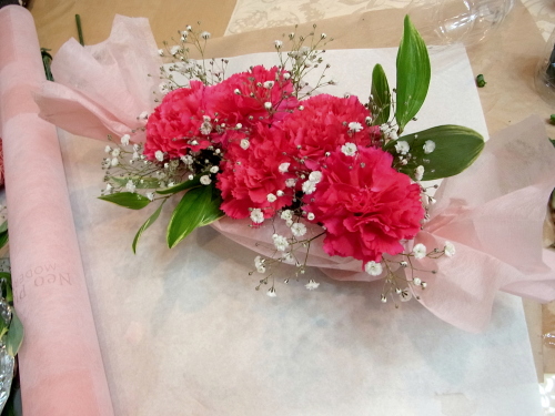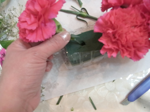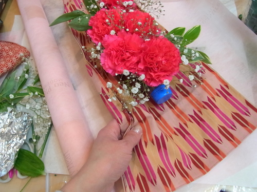 ラッピングシーン。カメラさんもぐっと寄ってとってくださいました。ワイヤーはNG.。いつも、つかってばかりの私にとっては輪ゴムオンリーでつくるのは新感覚!またまた新しい発見になりそうです。~ |