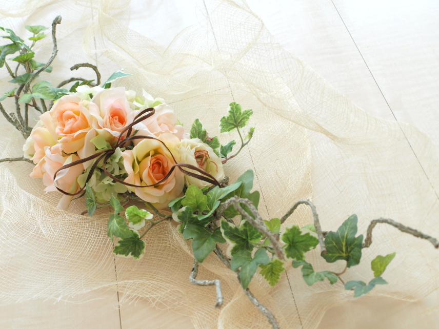 今回のアレンジはバラのホリゾンタルスワッグ。カラーは食欲増進の色「オレンジ」です。つるは自在に折り曲げられるので、カーブさせて丸テーブルにも、ストレートに長方形のテーブルにもOK。普段は壁にかけてスタンバイもできる優れものです。