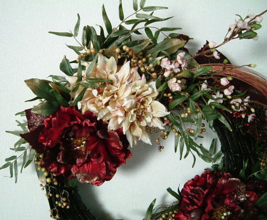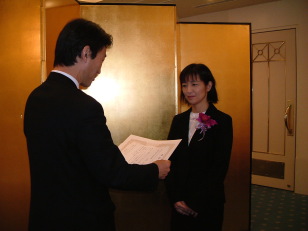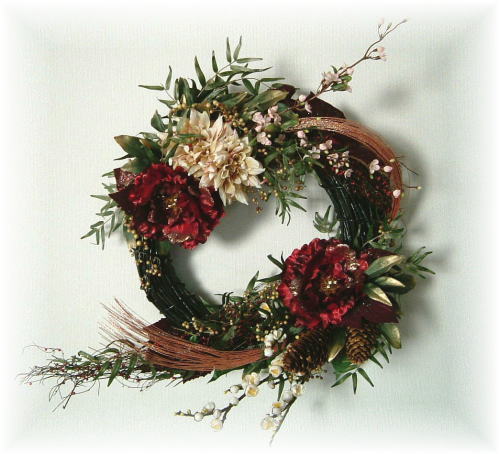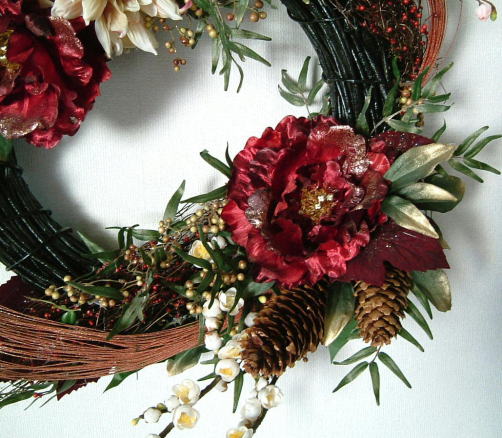 なにしろ、最近のアートフラワーは高級で細部まで生花そっくりに精巧につくられており、そのうえ色使いもとてもリアル。一輪、一輪手書きの美しさもありです。そのうえ枯れない、壊れない。簡単に曲がってくれる、持ち運びも気楽で夢のようです。そしてこうしてリースができあがったのです。素材が違うだけで全く違う雰囲気のものになりました。大輪のラメ入りの芍薬をメインに相当な和風ゴージャスぶり名前も「ジャパネスク」と命名。(かなり自分でも上出来で大満足!)そして・・・そんな新しいチャレンジをしたら、本当にホテルからお電話をいただいたのです。お蔭様で「総支配人賞」をいただきました。本当に嬉しかったです。ありがとうございました。