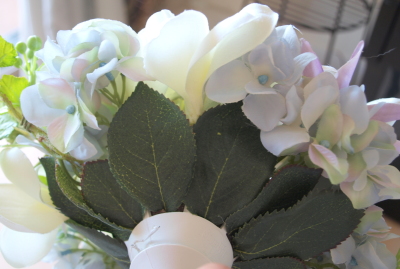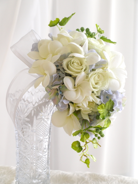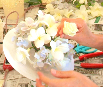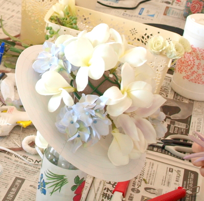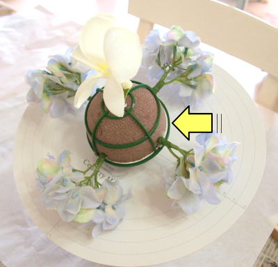 さらに大きくあいている箇所3〜4に、プルメリアか、アジサイをいれます。だんだんドームになり、ブーケのシルエットがイメージできるようになりました。 |