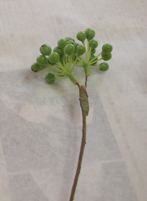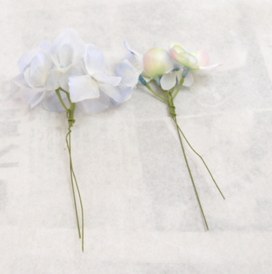 アジサイはステムから引き抜いて、そのままのものを4つだけとっておきます。4つは個別にステムをつけます。18番ワイヤーを4等分して、アジサイの引き抜いた穴にグルーで挿し直します。