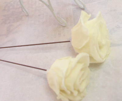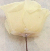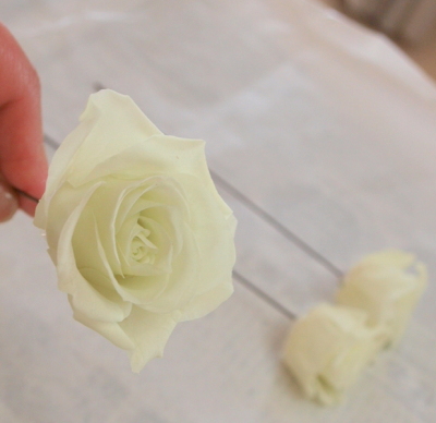 処理をしたプリザーブドローズを粗熱が取れたらそっとシリコンマットからはがし、18番ワイヤーを半分にして、先にグルーをたっぷりつけでド まわしながらドリルのようにさします。