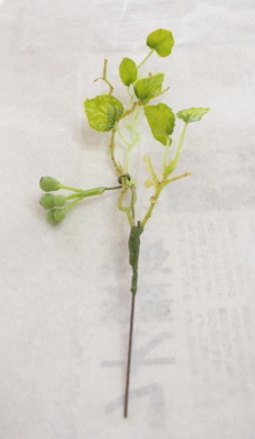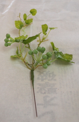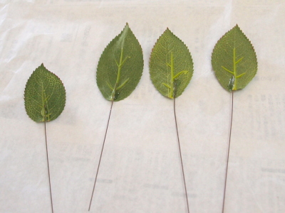 仕上げに、手元の小窓にワイヤーをはりつけた葉をさしていきますやや重なるようにいれましょう。綺麗な表を外にむけます。 |