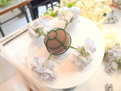 お花をボンドで挿していきます、花がフォームに埋まる部分は3センチくらいあれば十分です。長いステムはその都度カットしてつかいましょう。(ツル物はやや長くしておいてください)
