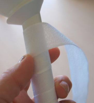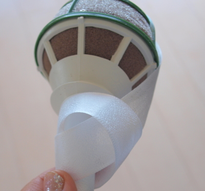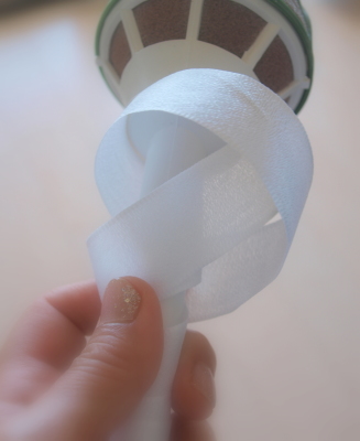 フレンチボウのリボンのワイヤーをホルダーのくびれに又がけして、しばります。回ってしまわないようにグルーで固定します。