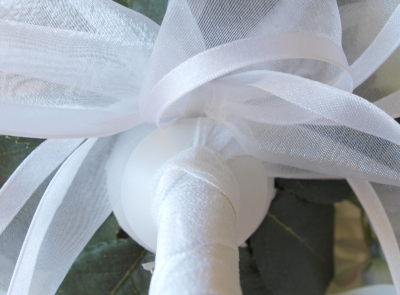 一周したら、リボンをつくります。太いリボンでフレンチボウを。細いリボンは巻き上げ用です。花嫁さんが持ってもすべらない 巻き上げ専用のリボンです。 |