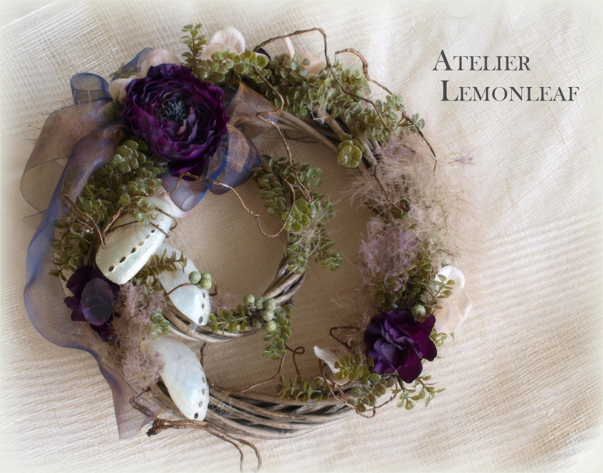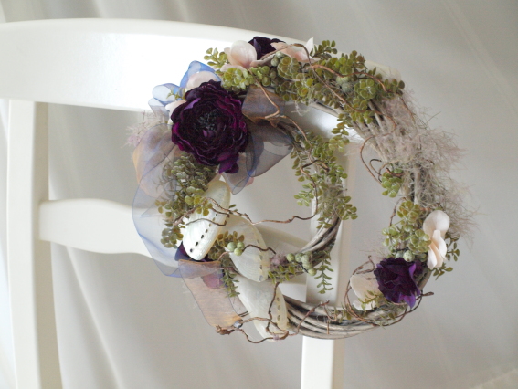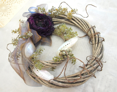 花材:柳リース大小、ミミ貝、アンティークベリー、スモークツリー