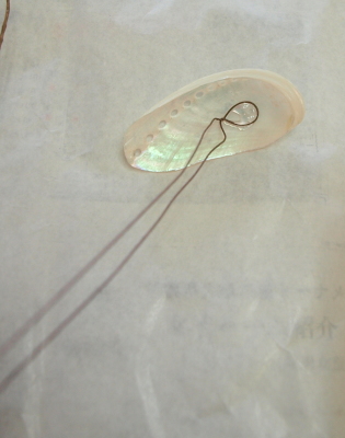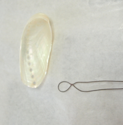 ワイヤーをUピンにして、トップをねじります。ねじった部分を90度にまげて、貝の内側にグルーでつけます。 |