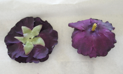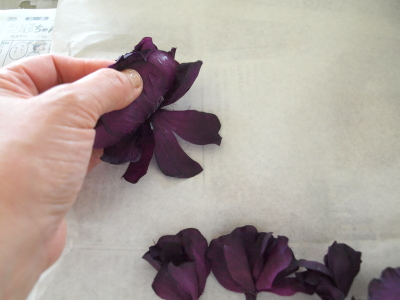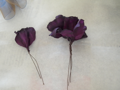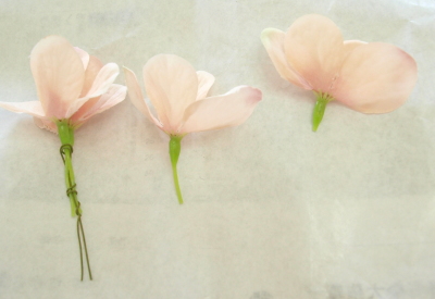 はがれた花びらは一枚をつまんで、小花にして、1/2のワイヤーでワイヤリングします。