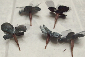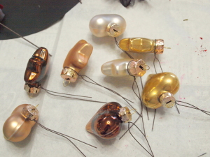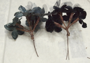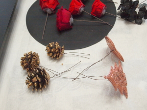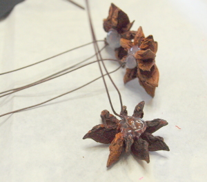 (3)  八角、松かさ、アイテム(星、ハート・レース)にワイヤーでステムをつけます。アジサイを大小小分けにして、ステムをつけます。