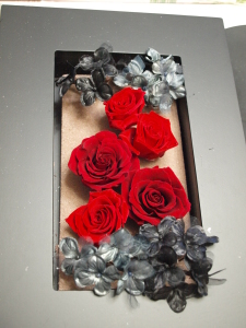 花材:プリザーブドローズ赤2種、レーシーオーナメント、