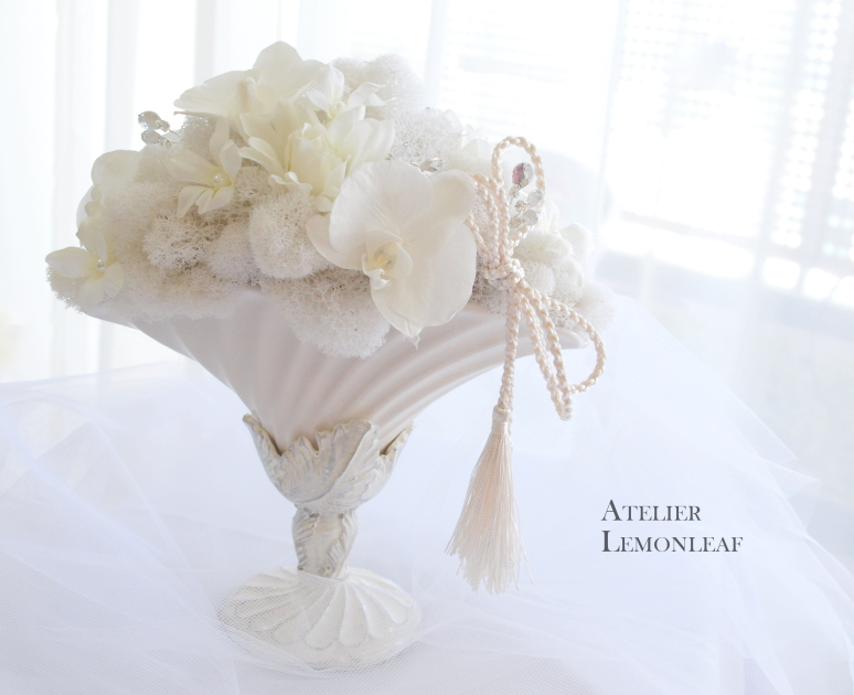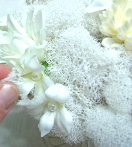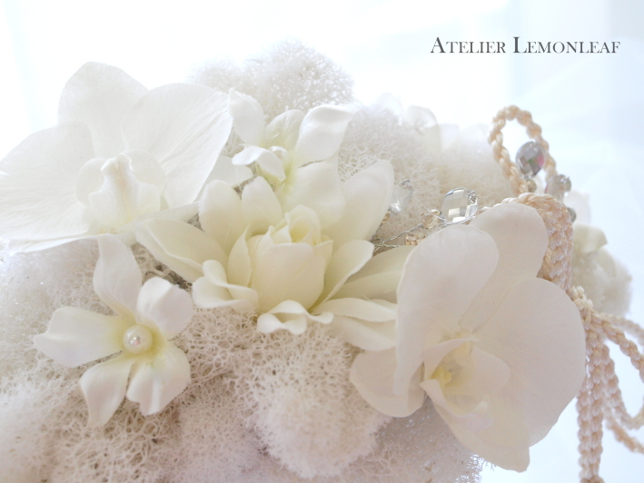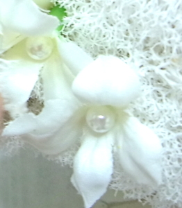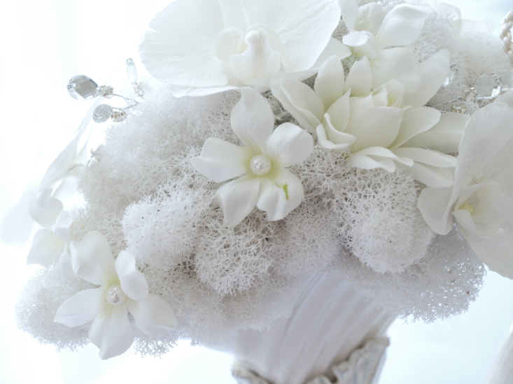 今回のまっ白でふわふわなモスとコチョウランの組み合わせ、とても清楚で上品な印象アレンジになりました。