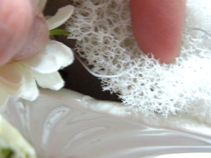 ボンドをつけてフォームにさしますが、そのへの抜き差しはかならず、ワイヤーをもってくさいね。プリザのお花は引っ張るとちぎれます。