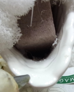 写真の用にセットし、ボンドを器との接点につくようにつけます。(実はこれが難しい、つけたところが空間だったりします。上から見てくださいね。グルーガンも併用するとさらに固定されます。)