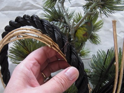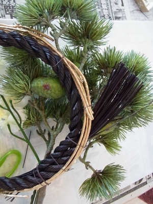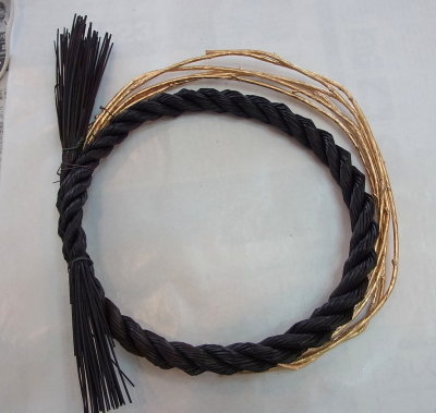 弦の輪よりも小さめに丸めたしめ縄をつくり、ふたつ一緒に合体させます。