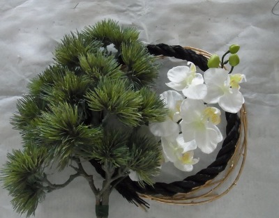 宙ぶらりんな位置よりもぐっと天を仰ぐか、押さえの締めの位置が和物のアレンジには似合います。 |