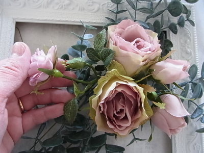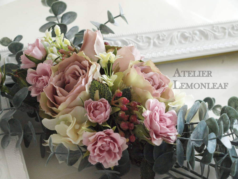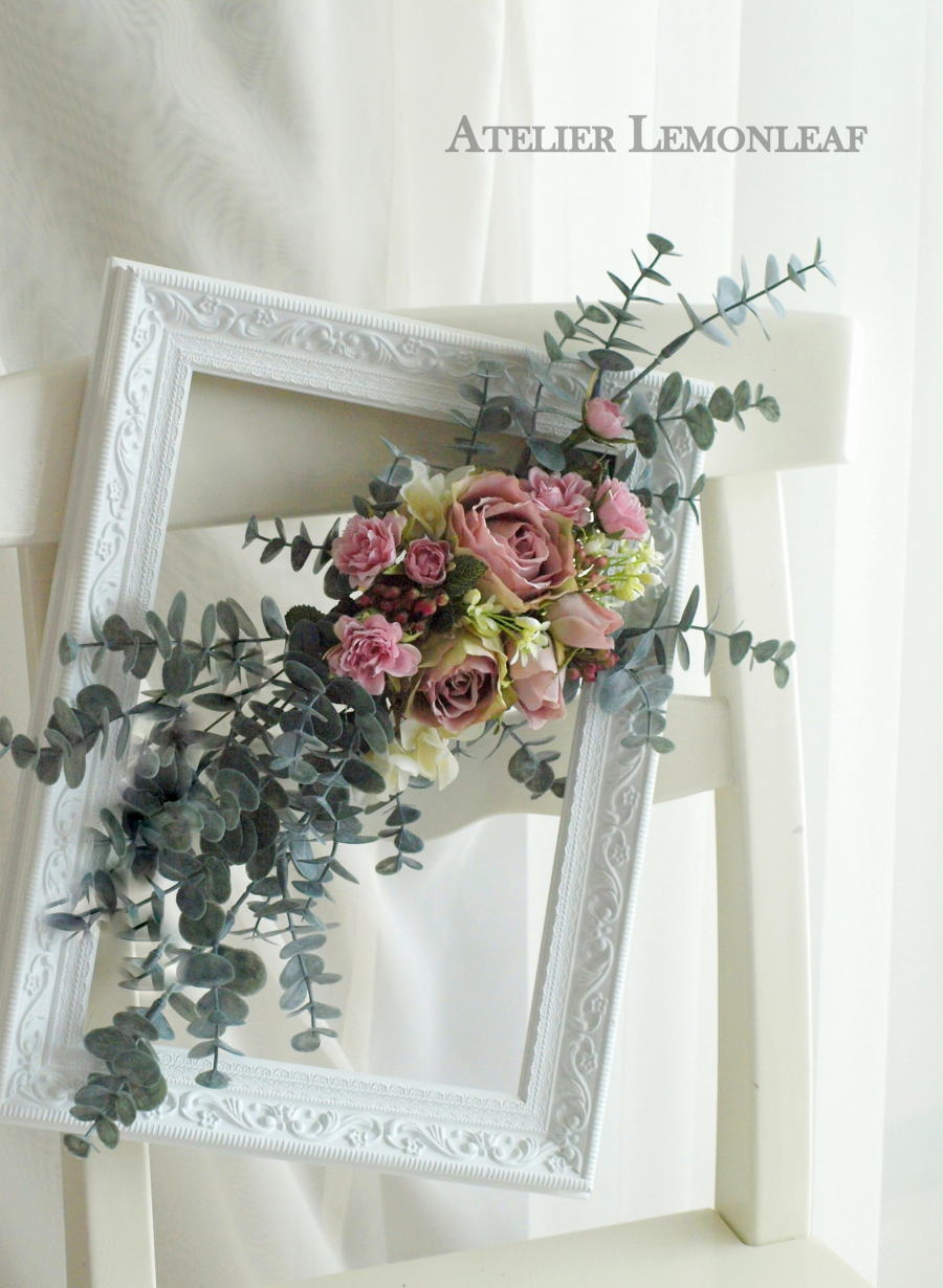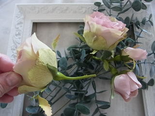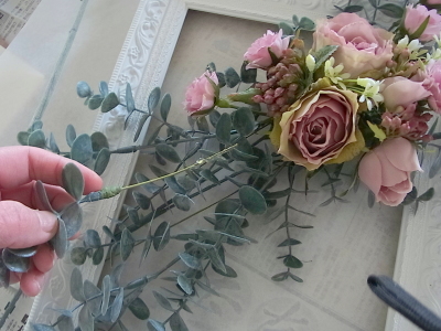 お花を少量入れ、ユーカリがはいったあとに、またお花にもどるほうが、バランスがとりやすいです。
