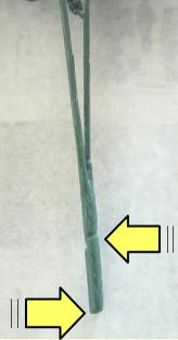 上の作り方に下から17センチをカットとありますが、または、茎の二股にわかれたとの溝、その二つ目で切りましょう。2本とも左のような長さになります。 |