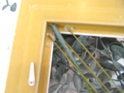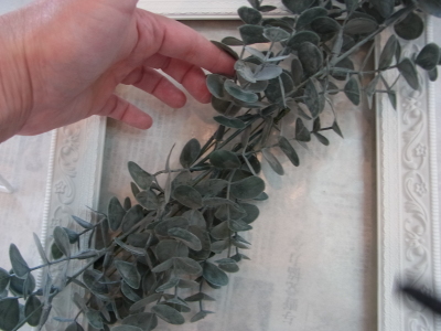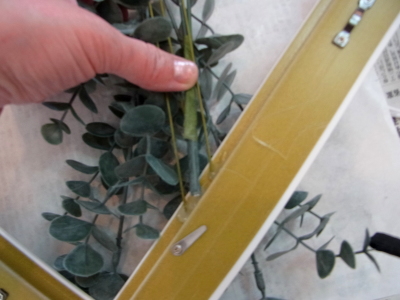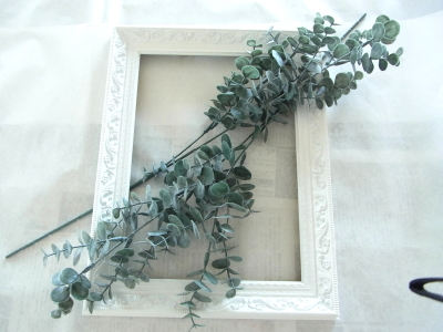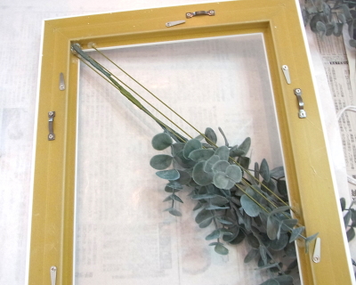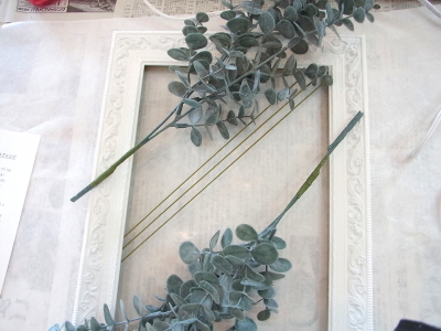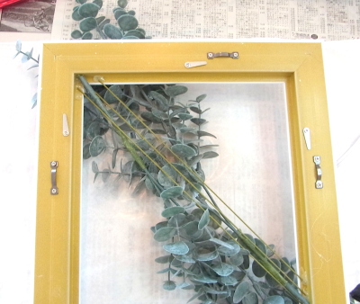 先ほどのユーカリを1本を左下からワイヤーの間にさしこむようにして右上の対岸の角に固定します。 |