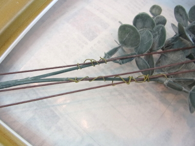 裏面にとびだして、ひきぬいておいてたユーカリは、太いワイヤー1/3をカットしたものを差し戻し。