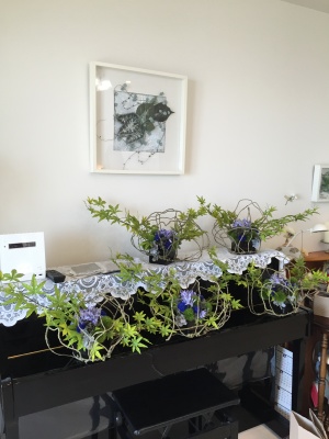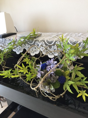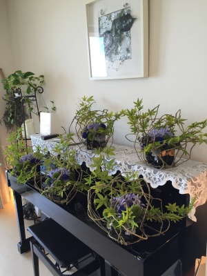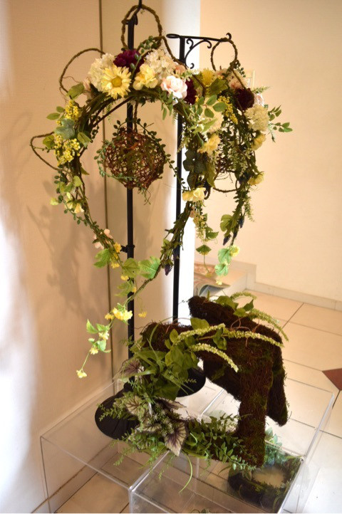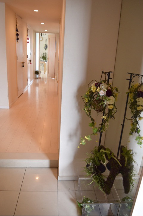 実はこのムーン型のボディも、ラスティックワイヤーでつりました。ワイヤーを組んで、あとからボールをつるし、花をとめています。我が家の玄関にて。