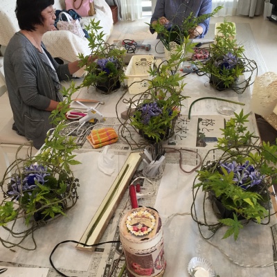 (7) ラスティックワイヤードームが完成したら、モミジのアレンジをセットします。