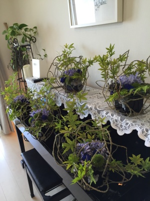 アジサイはくすみカラー。アレンジにくすみをいれることで、時間の流れや、奥行き、重厚感がだせます。