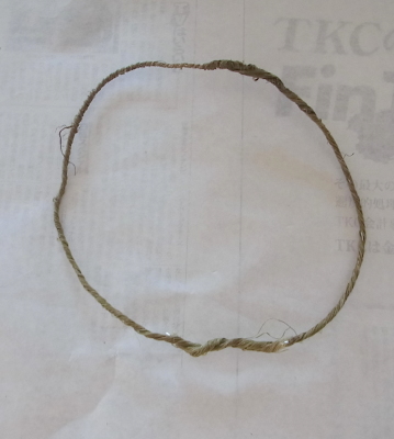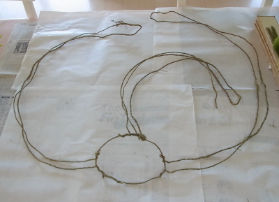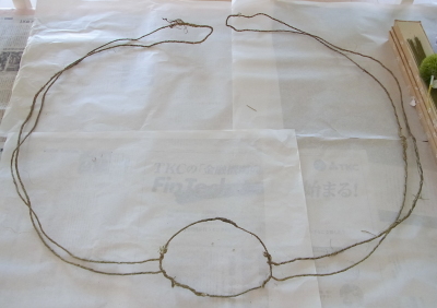 (1) ラスティックワイヤーを2メートルX3と 50センチを用意します。2本を半分におり、1本は3等分におります。50センチで土台の円をつくります。器がその円に入るかチェックしておきます。