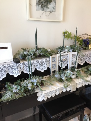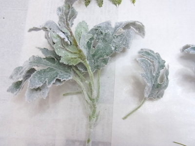 一つの花材を全部つかってから、次にいくよりは、少しづつ、いろいろな種類をいれては またダスティミラーにもどる、というようにすると、デザインのイメージがつかみやすくなるだけでなく、あとから、いい場所がみつけられます。 |