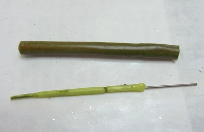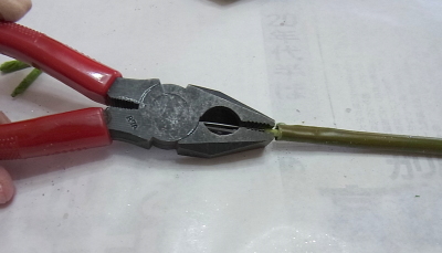 葉のほうについて出てくればいいのですが、写真のように、茎に芯棒がついてきてしまったら、ペンチで抜いて、元に戻します