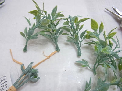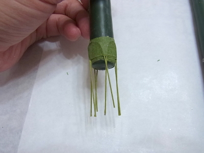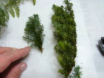 ヒムロ杉は小分けにしましょう グルーでつけていきます。大きいままいれると、ぼさぼさになるので注意を。 |