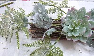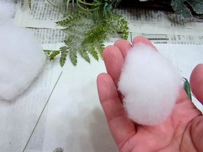 ちぎったまま使うと、霧のようになって花材がかくれてしまうので、軽く手のひらでまるめて置くと、雪らしくなります。