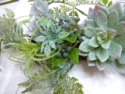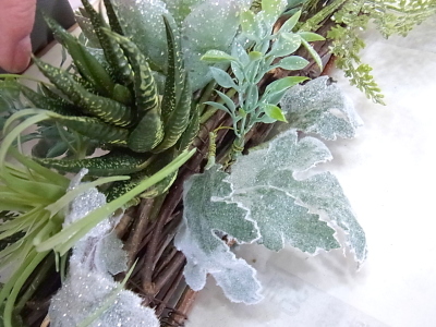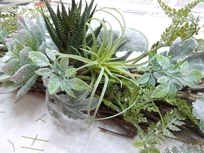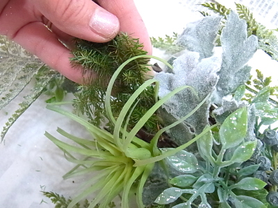7〜8割はいったら、サブメインの ハルオチアやエアプランツをいれます。しあがりは低めのドーム型をめざしましょう。