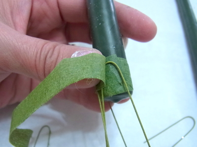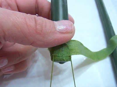 最初にまいた テープの上にUピンをおしつけるようにおいて、フローラルテープで巻きながら、4つ挟み込みます |