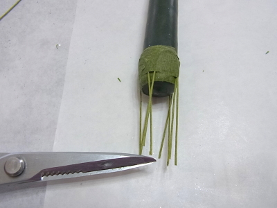 芯棒が葉っぱについてきたら、それはラッキー♪持ち手3センチくらいにカットします |