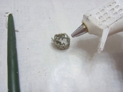 測ってから、輪にしてグルーで止めます。キャンドルに巻いてそのままつける場合は、グルーがつくととけますので、注意してください |