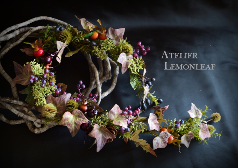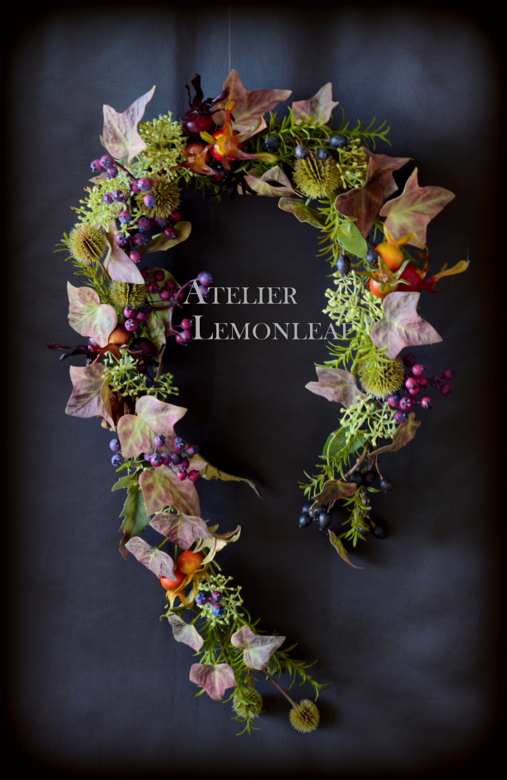 こんにちは 関東もこの頃、だいぶ朝夕は寒くなってきました。さて今回はかわいいローズヒップが揺れる馬蹄形リースです。一見、手の混んだガーランドにみえますが、こちらは別の作り方をしています。