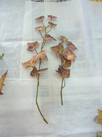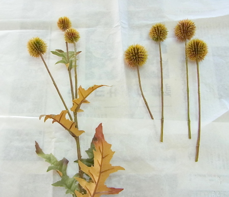 注意 フローラルテープはグルーがつきませんので、一旦つきますが吸収してしまいます。葉っぱの裏や、アザミのギザギザの中など、接着面をさがしましょう。