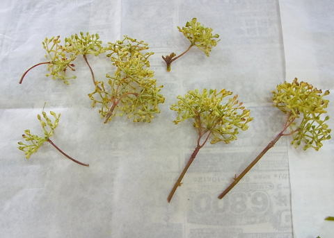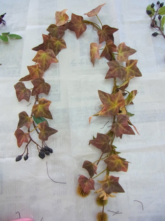 シキミアは赤色がはいっている方が半分おられます。私のつくった時点のサンプルのアイビーと緑の濃さがすこし違いものがあったため、シキミアで色調整しています。