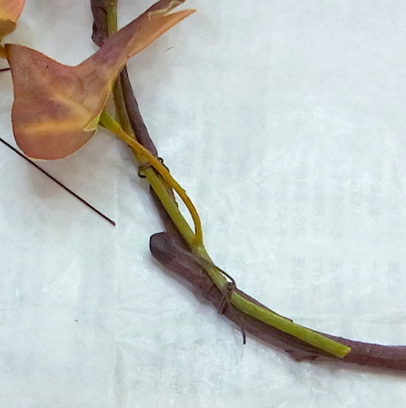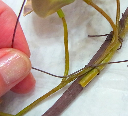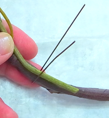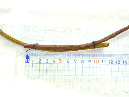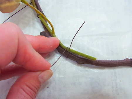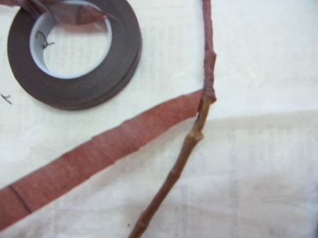 茎をクロスさせたら、葉のないところは、全体をテープで巻きます。余ったらさらにうえから、重ねてください。