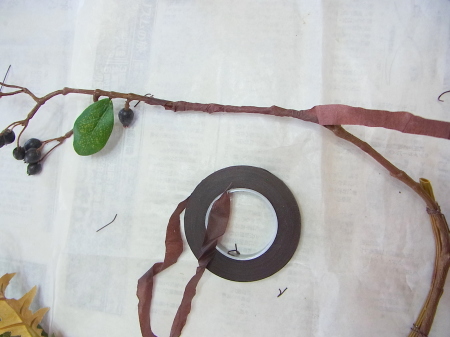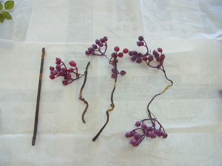 (1) 先端だけに実を少しのこした、黒いベリーとアザミをの枝を10~12センチクロスさせます。ワイヤーで固定+ベース全体にフローラルテープを巻きます。