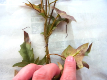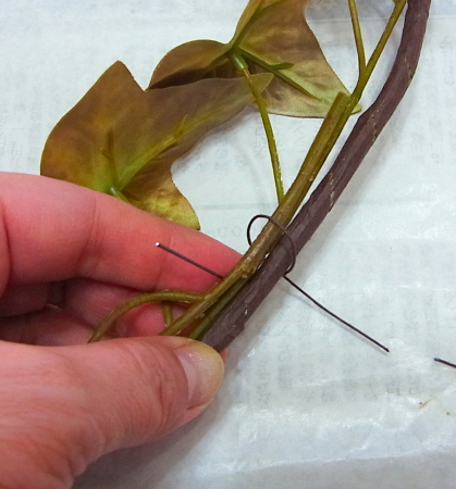 場所が決まったら、アイビーの葉をかきわけて留めつけます。縛り目は表面に。葉でかくれます。後ろ側にすると壁が傷つくことがあります。
