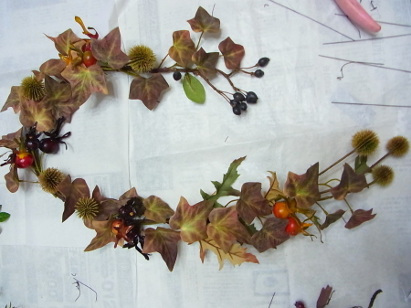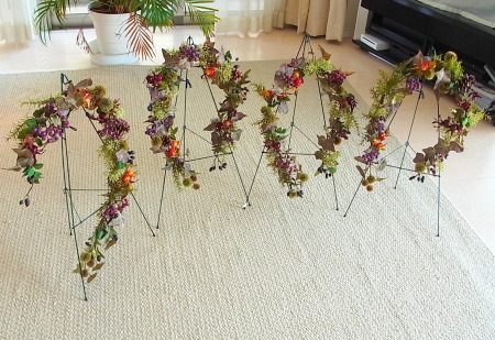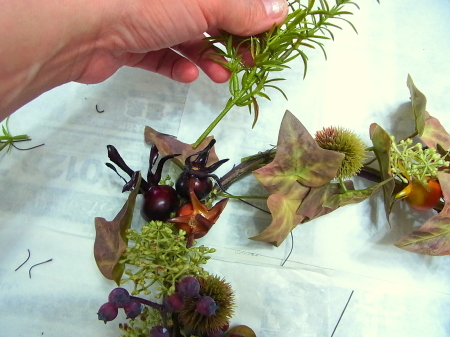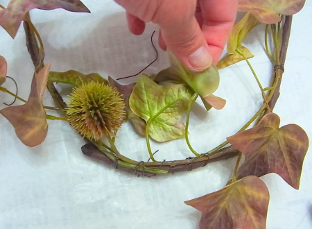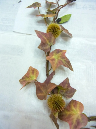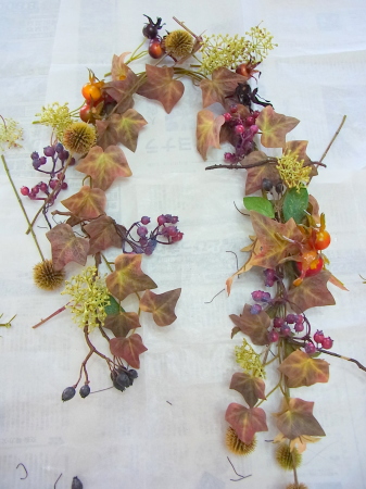 (2) 小分けにした、アイビーをベース全体にワイヤーでとめつけます。ローズヒップも小分けに、枝から外したアザミも手のひら大の長さに小分けします。ローズヒップをワイヤーとめ、アザミは二か所で固定します